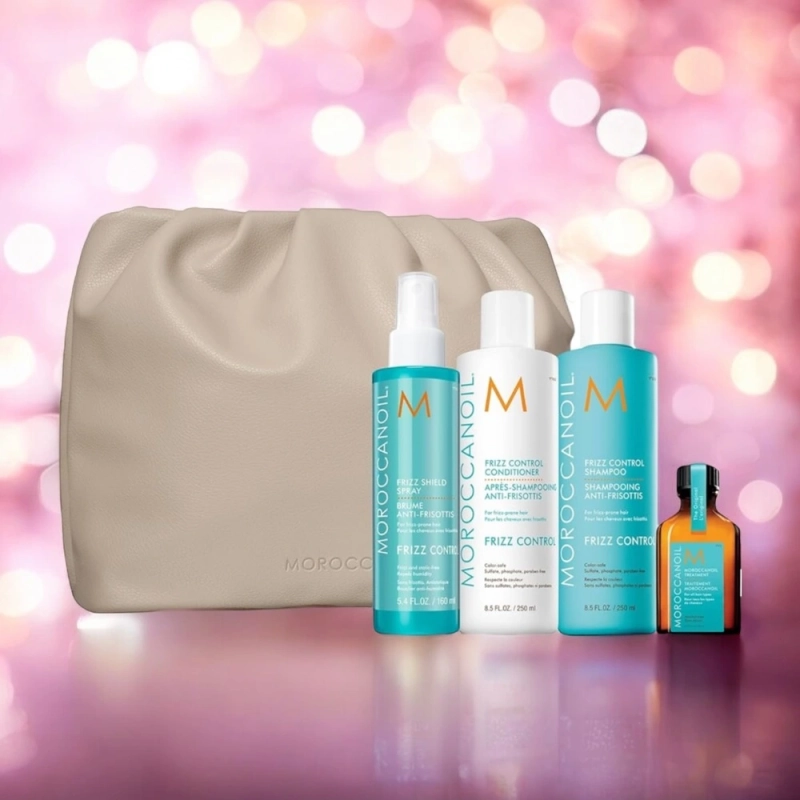 Moroccanoil Frizz Control - zestaw do włosów nieposłusznych i puszących się (szampon, odżywka, odżywka bezspłukiwania, kuracja) + kosmetyczka w prezencie