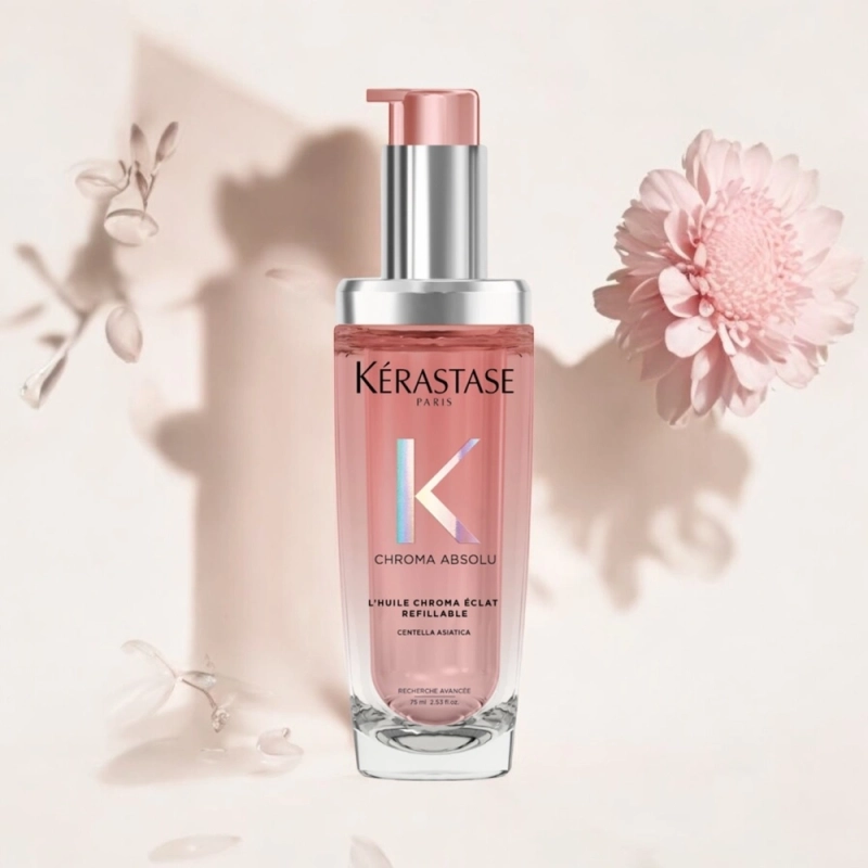 Olejek Chroma Absolu z możliwością ponownego uzupełniania nadaje długotrwały blask włosom farbowanym. Wzbogacony ekstraktem z wąkrotki azjatyckiej, rośliny dziko rosnącej w tropikalnym środowisku, chroni kolor włosów i sprawia, że emanują aurą uwodzicielskiego zapachu.