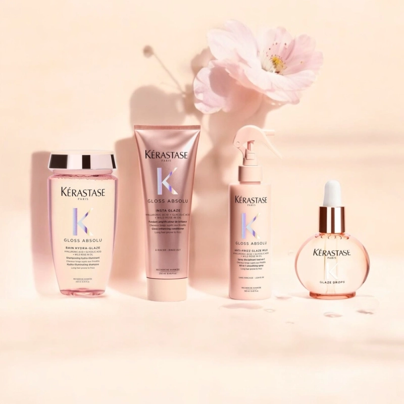 Kerastase Gloss Absolu Insta Glaze - zestaw dla włosów puszących się, nawilżająco-nabłyszczający (szampon, odżywka, mleczko, olejek)