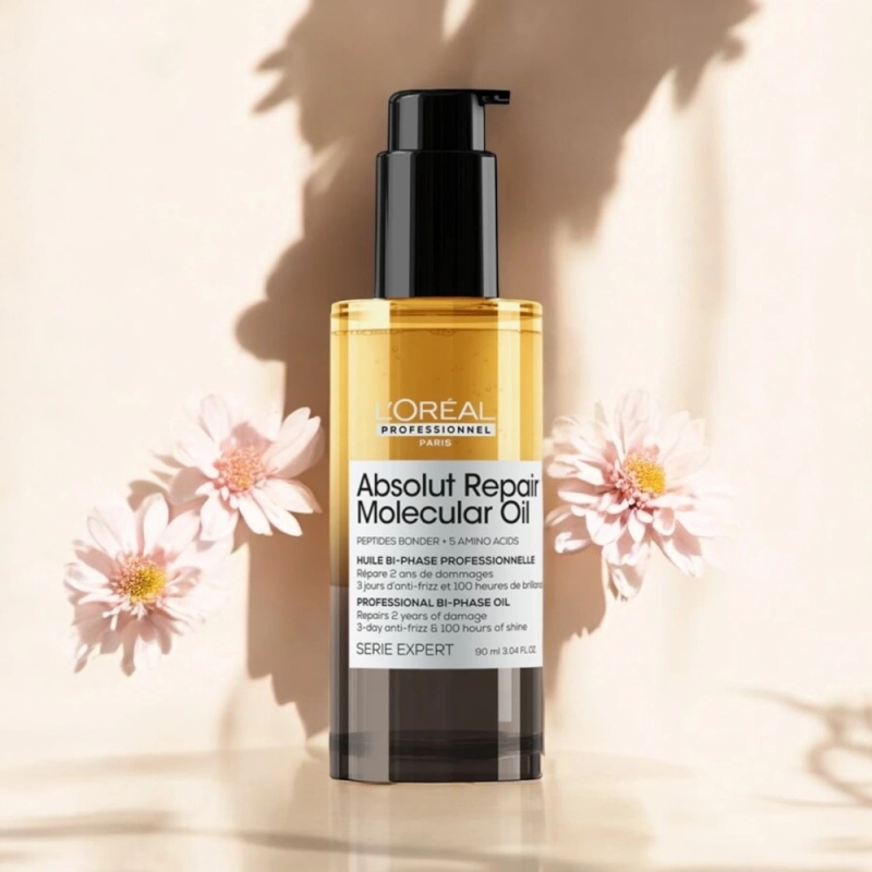 Olejek L'Oréal Professionnel Serie Expert Absolut Repair Molecular Bi-phase Oil naprawia uszkodzenia włosów na poziomie molekularnym, przywracając im wygładzenie, odżywienie i blask bez niepożądanego obciążania. Dwufazowa formuła łączy wiązania peptydowe z aminokwasami, odbudowując włókna włosowe, zapewniając nawet do 100 godzin większego blasku, do 3 dni kontroli nad puszeniem się i jedwabiste wykończenie dla każdego rodzaju zniszczonych włosów.